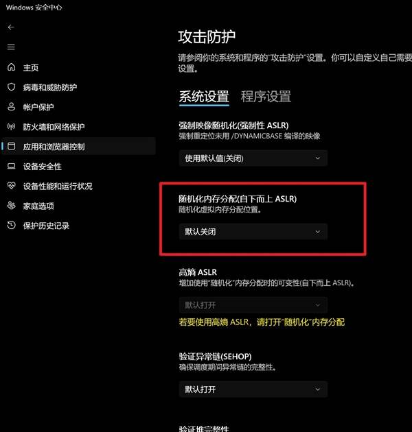 长话短说,在Windows安全中心内,关闭随机化内存分配,并重启电脑。