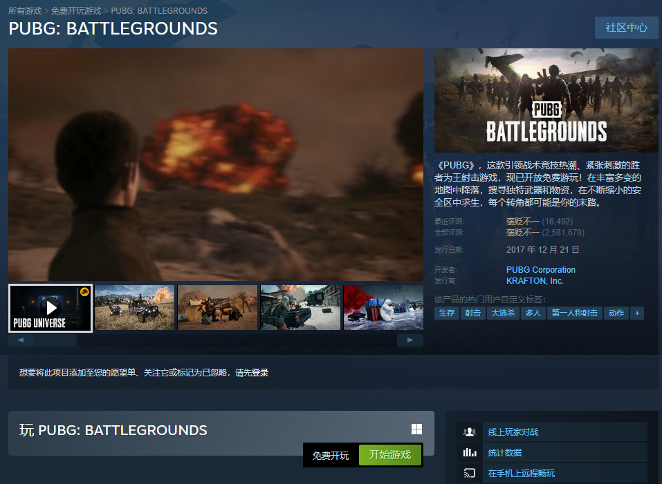 绝地求生大逃杀游戏在steam平台上叫做PUBG: BATTLEGROUNDS,如果搜索绝地求生大逃杀肯定是找不到的,进入游戏购买界面,直接点击开始游戏即可入库,游戏会马上下载。