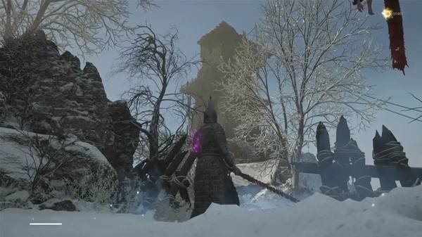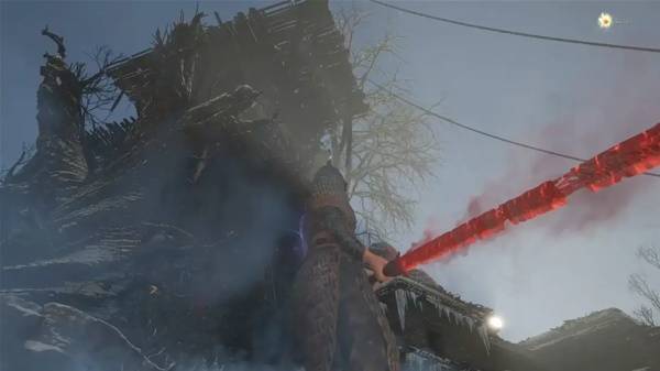 这片区域一共有3个篝火,就是冒血烟的那堆东西。上面连接着两根绳子,绳子的另一头就是点火的地方。我们需要爬到高塔的最顶端点火。