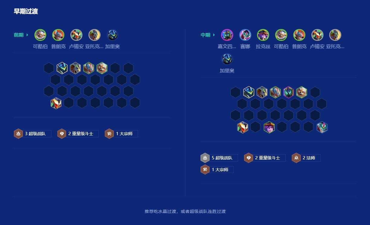 永恩、皇子、卡尔玛组成3超级战队,格温和赵信组成2斗魂,后面补个布隆组成2护卫,外加狗熊凑上2假面,阵容需要的经济非常多,最好开局拥有2个经济类的海克斯在考虑,要不然撑不到阵容成型。